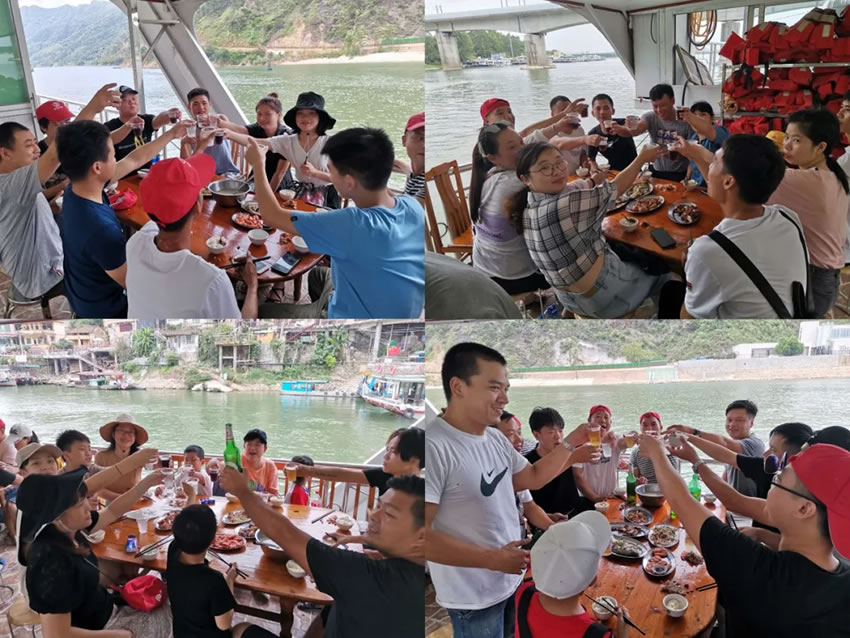 中午,杏盛前往清远北江,泛舟于江渚之上,一览北江景色。丰盛的午餐就安排在北江游船上,江面波光粼粼,清风徐来,甚是惬意。