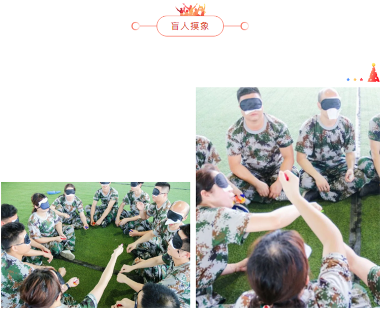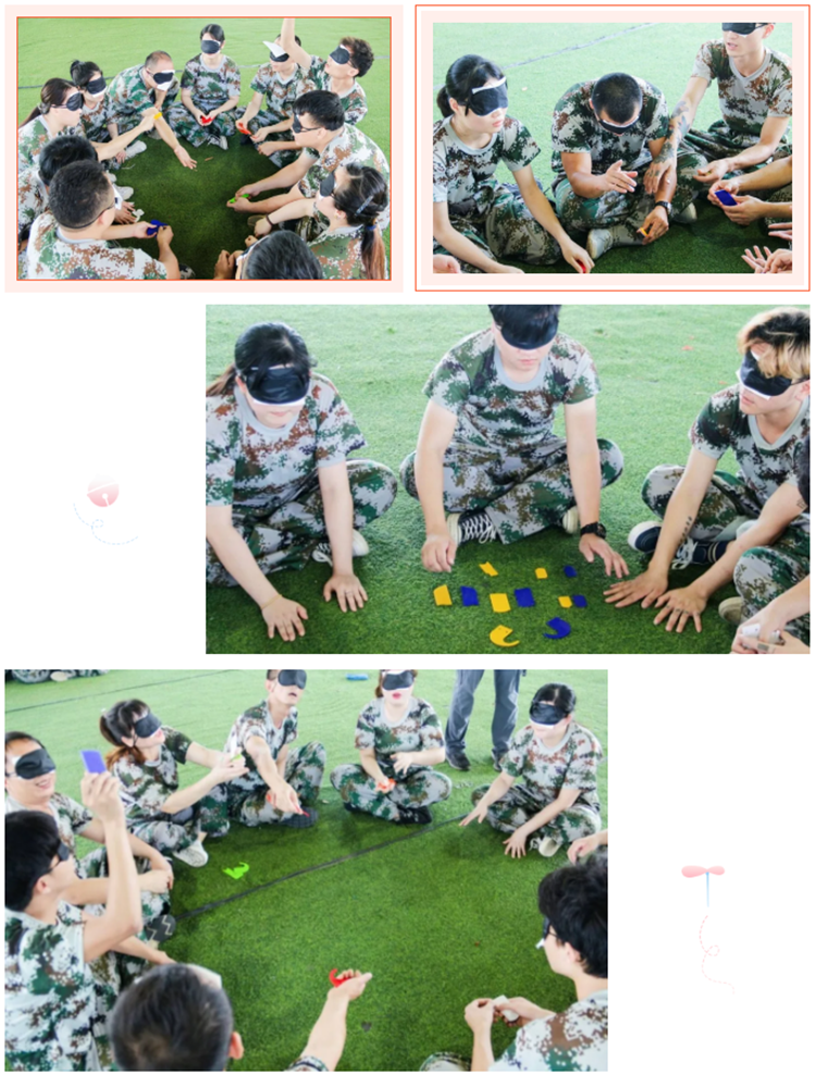 四组成员各自蒙住眼睛,每组团队都会拿到34张6种颜色和6种形状的卡片,其会有2种颜色各自缺少一个形状的色板,每名成员将从教练手中领到2—3块色板,团队成员只能询问教练拿到的版的颜色,团队成员需要通过有效的沟通,合作,分析来判断缺少的是那种颜色,哪个形状算完成团队任务,以计时的方式得出胜负。