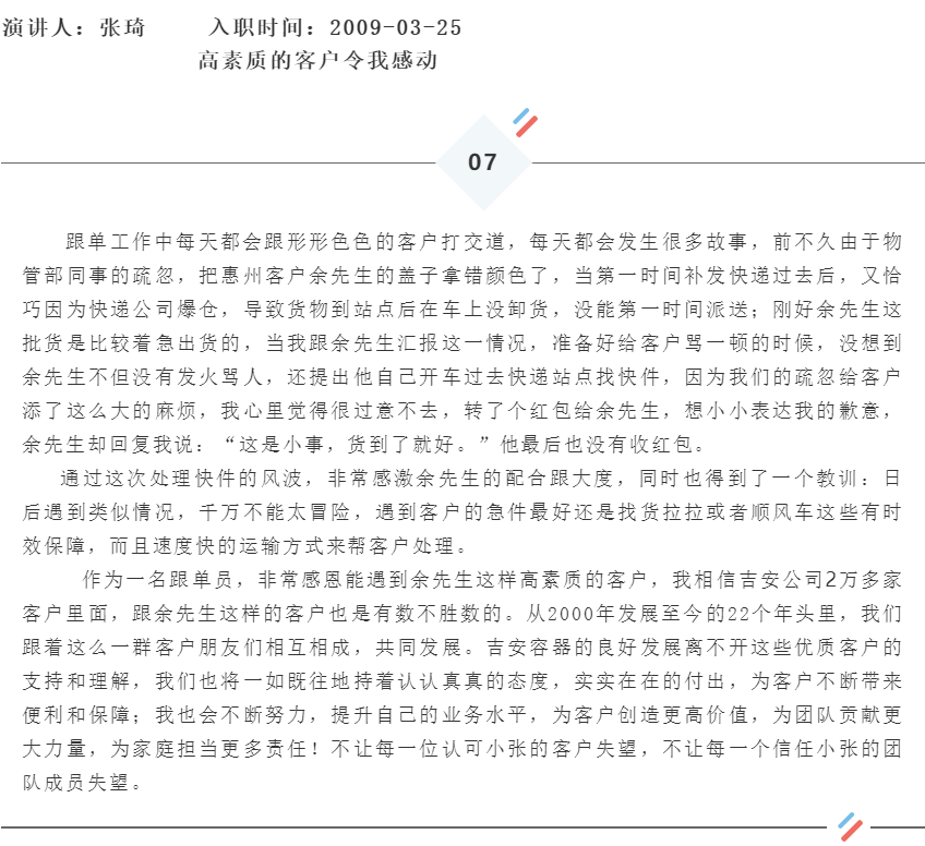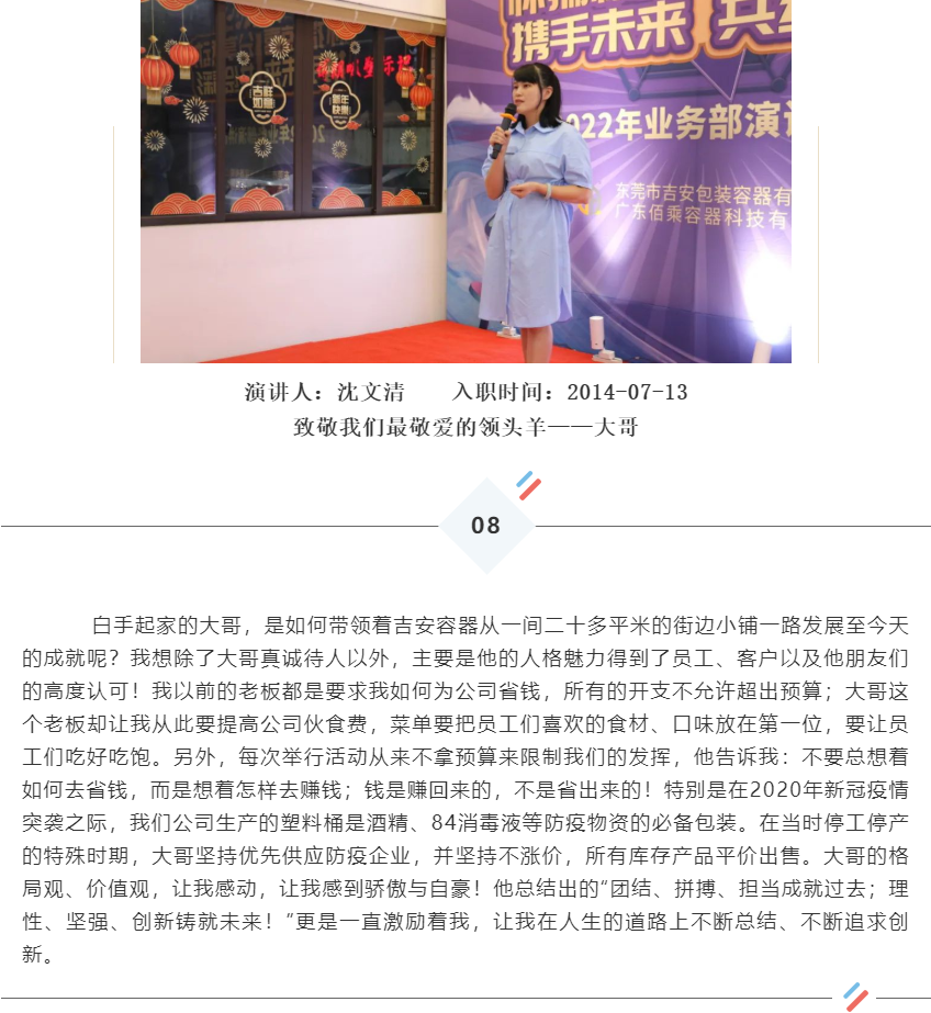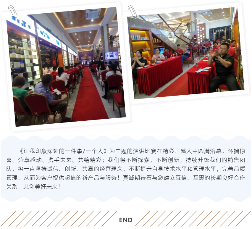杏盛平台业务部在8月12日举行了一场精彩纷呈的演讲比赛。业务部的13名成员围绕《让我印象深刻的一件事/一个人》为主题,上台分享自己的故事。这是杏盛第二次举行演讲比赛,在去年的演讲比赛中,杏盛得到了一个很大的挑战和突破。有的同事通过这次演讲克服自己上台的心理障碍,迈出了勇敢的第一步,有的同事提升了自己的表达能力,有的同事学会了演讲的礼仪等等,每个人都从中得到了不同程度的提升。所以在今年,杏盛再接再厉,在原先的基础上再次突破自我。不同于上次只是部门内部的分享,本次的比赛面向全公司所有部门,全体同事既是观众,也是评委,杏盛各自上台分享自己的故事。下面由小编为您整理13位参赛选手的精彩故事(节选总结),让杏盛一同探讨,共同进步!