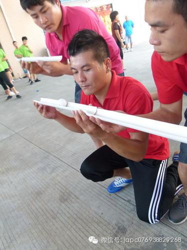 第三项比赛是最有挑战性的项目——运球。规则是:1、每组人员5人为1小组,分成三小组,ABCD组同时进行,分三回合同时进行比赛。四组同时进行,每个组员手上有一条PV管。2、由第一个开始运,在5分钟内成功的将球掉入指定的桶里面就算结束,根据四组最快为第一名,以此类推,要求球不要掉下来,也不可以倒退,如果掉下来或者是倒退的话就要重头开始,把PV管反过来两个人为一根管来运,规则与第一条一致。3、第一名5分,第二名加3分,第三名加2分,第四名加1分;如果5分钟内没有完成的小组,均不加分。