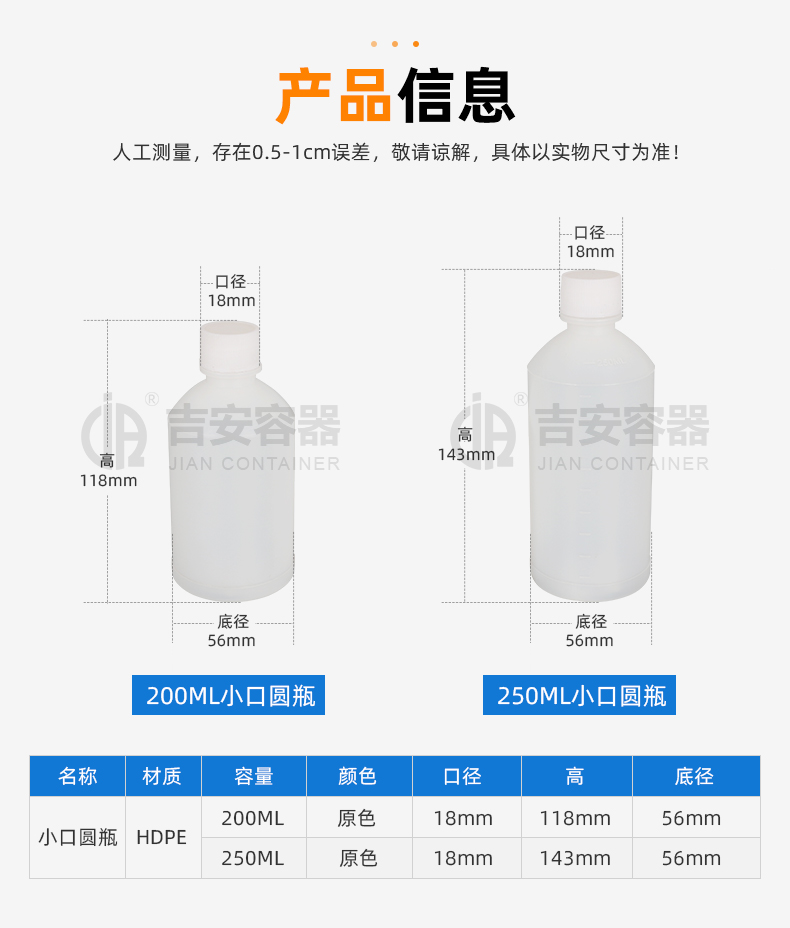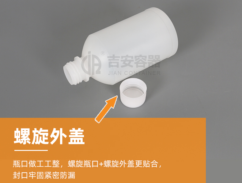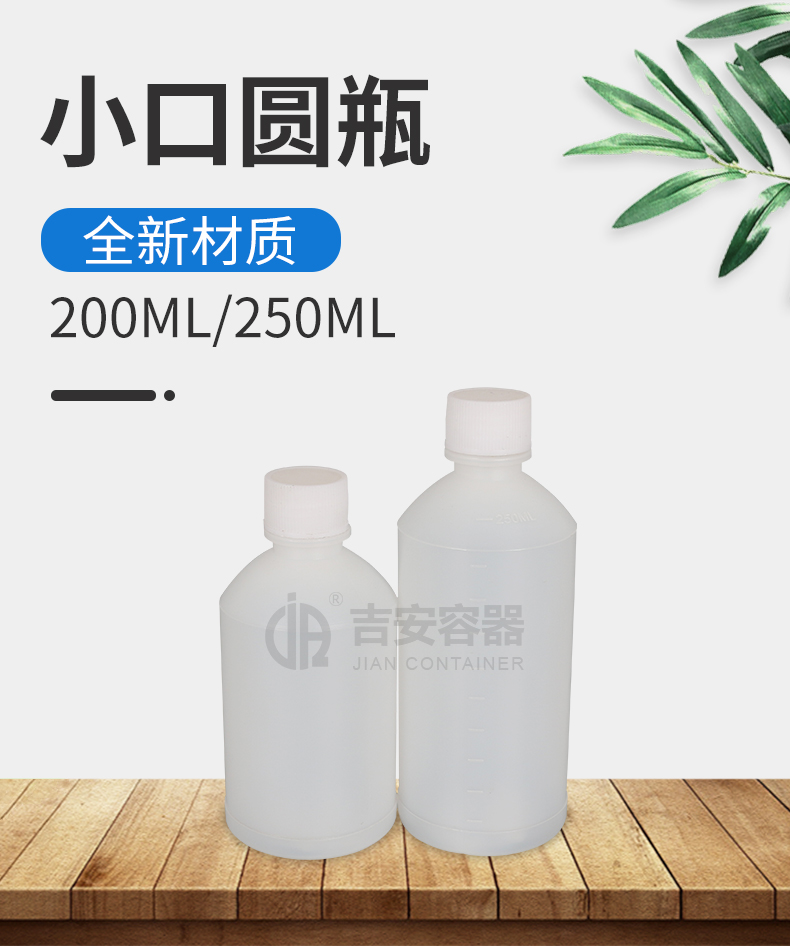 小口塑料瓶采用全新HDPE塑胶原料吹塑而成,具备韧性好、耐酸碱、耐腐蚀、不变形,密封性能佳等特点,可根据客户需求定制、改色、产品适用于化工、清洗剂、医药、液体、食品、农业等各行业包装。