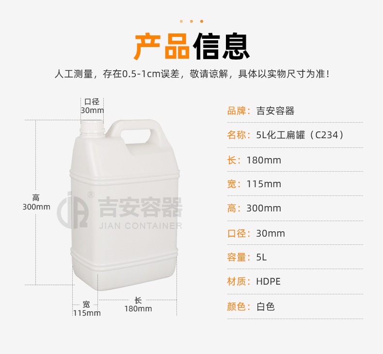 塑料扁罐采用HDPE原材料吹塑而成,具有良好的耐酸碱性及密封性,方形设计方便堆放,不占用空间,美观实用。具备不变形,使用方便等特征,可根据客户需求做印刷及贴膜,产品适用于尿素、机油、汽油、清洗剂、化工助剂、食品添加剂等液体包装。