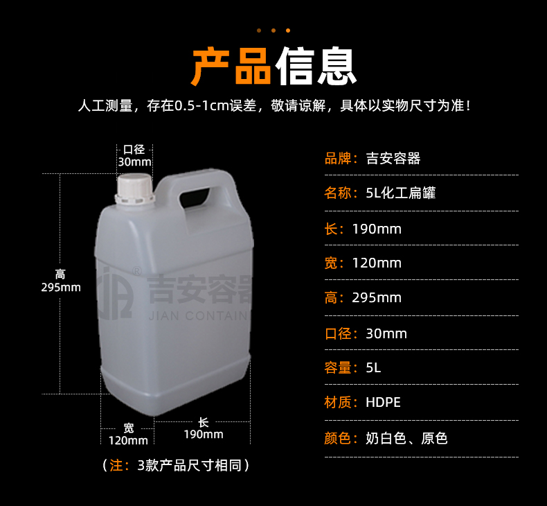 塑料扁罐采用HDPE原材料吹塑而成,具有良好的耐酸碱性及密封性,方形设计方便堆放,不占用空间,美观实用。具备不变形,使用方便等特征,可根据客户需求做印刷及贴膜,产品适用于尿素、机油、汽油、清洗剂、化工助剂、食品添加剂等液体包装。