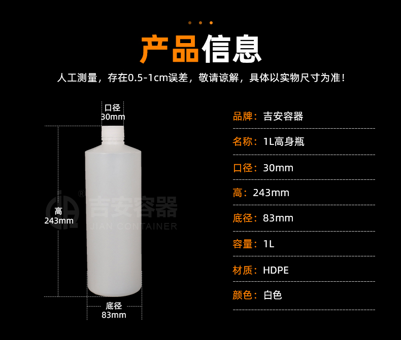 小口塑料瓶采用全新HDPE塑胶原料吹塑而成,具备韧性好、耐酸碱、耐腐蚀、不变形,密封性能佳等特点,可根据客户需求定制、改色、产品适用于化工、清洗剂、医药、液体、食品、农业等各行业包装。