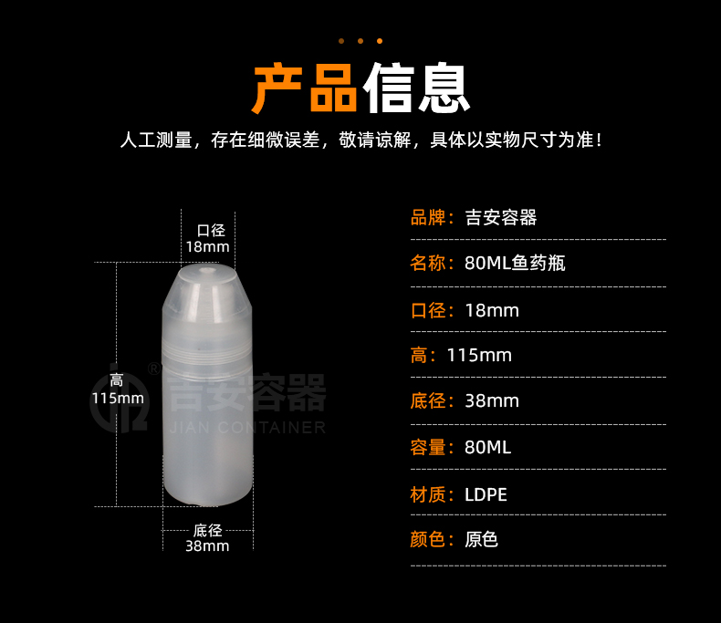 | 材质:瓶身-LDPE,瓶盖-HDPP | |